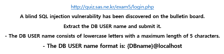 ASCII(SUBSTR(SUBSTRING_INDEX(USER(),'@',1), i, 1)) >= x - where i is the character position (1 to 5) and x is the ASCII value tested. By observing TRUE/FALSE differences, I could perform binary search or bruteforce in range 97-122 which means a – z to deduce each character.