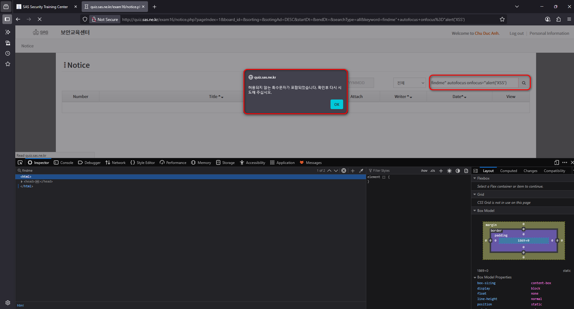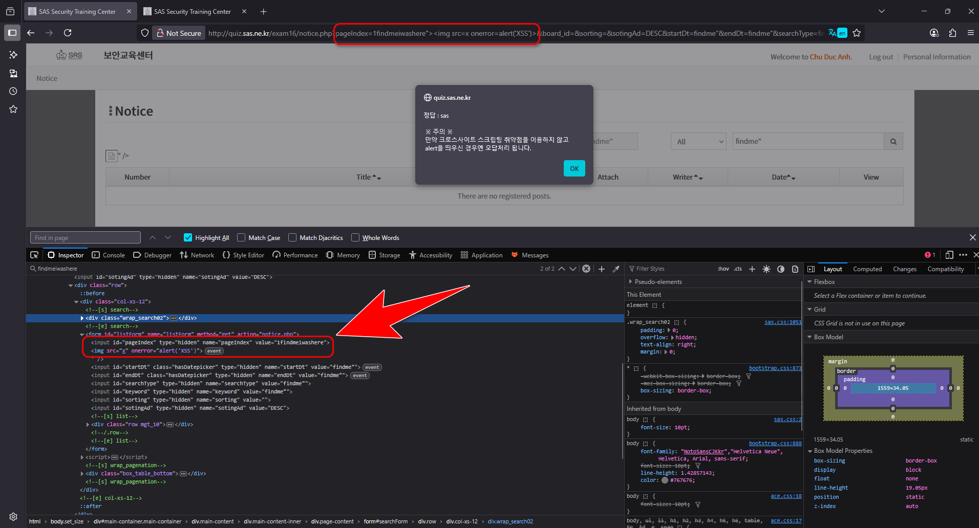 Now that we can see although everything seems to work fine, but the pop-up alert didn’t appear. I did some research to find out why, it turned out that it’s because the type of the input tag is set to “hidden”. If a thing was not a visible input like type=text, checkbox then it are not a parts of the interactive DOM => The JS won’t be executed