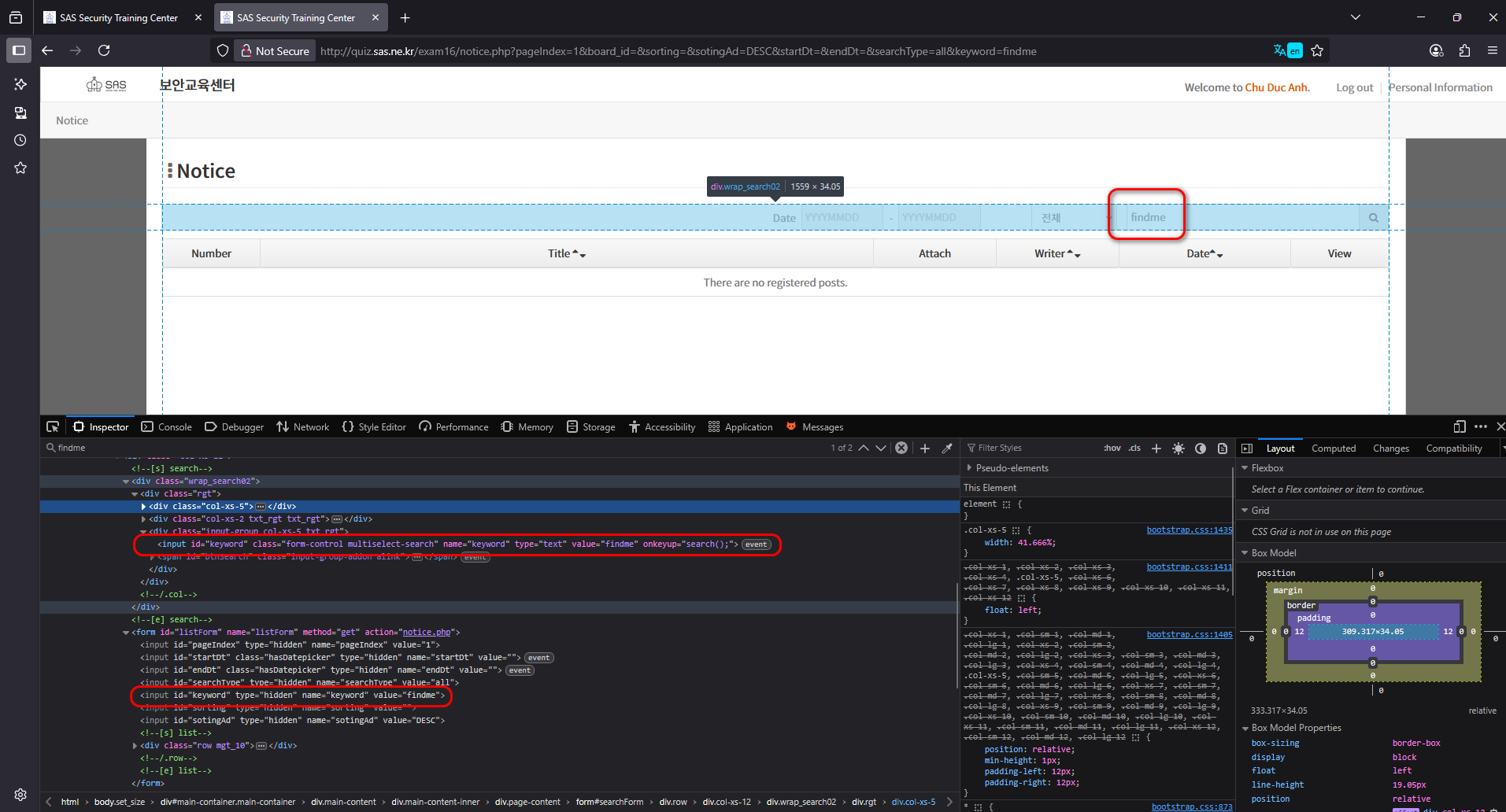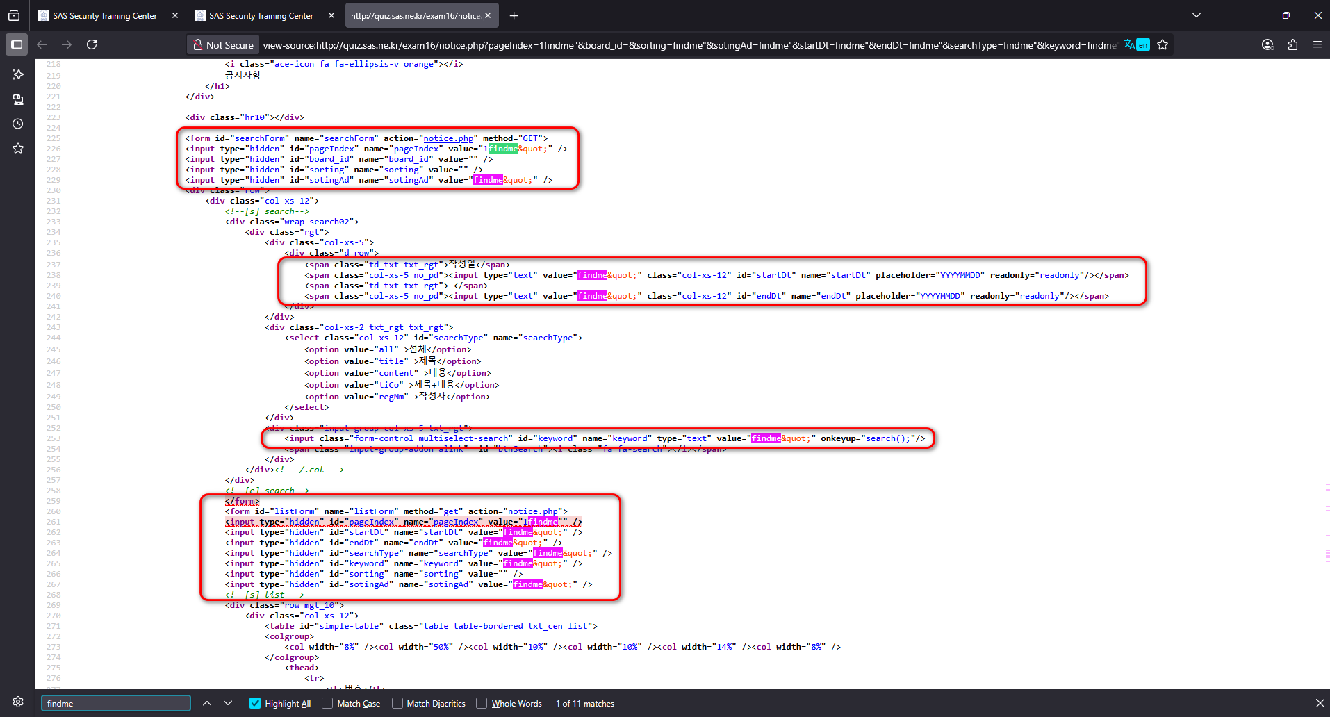 After navigating through the website, the search function at the home page appeared to be the only candidate worth deeper inspection because there were no comments, no others places that could take in user input. To verify if user input was being reflected in the response, I injected a benign test string “findme” into the search box.