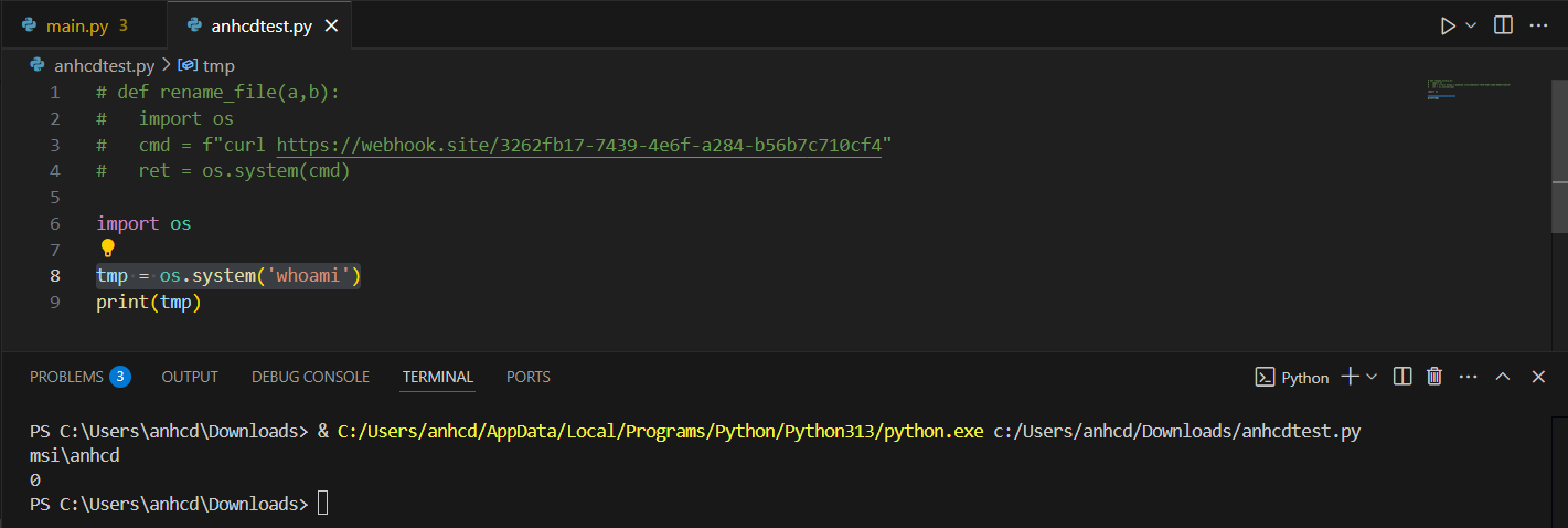tmp = os.system('whoami')thenprint(tmp)returns: