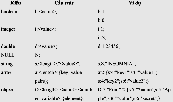 Trong PHP, một dữ liệu sau khi trải qua quá trình serialize được gọi là serialized data, đây là một chuỗi lưu các thuộc tính theo dạng datatype - data, chẳng hạn như: