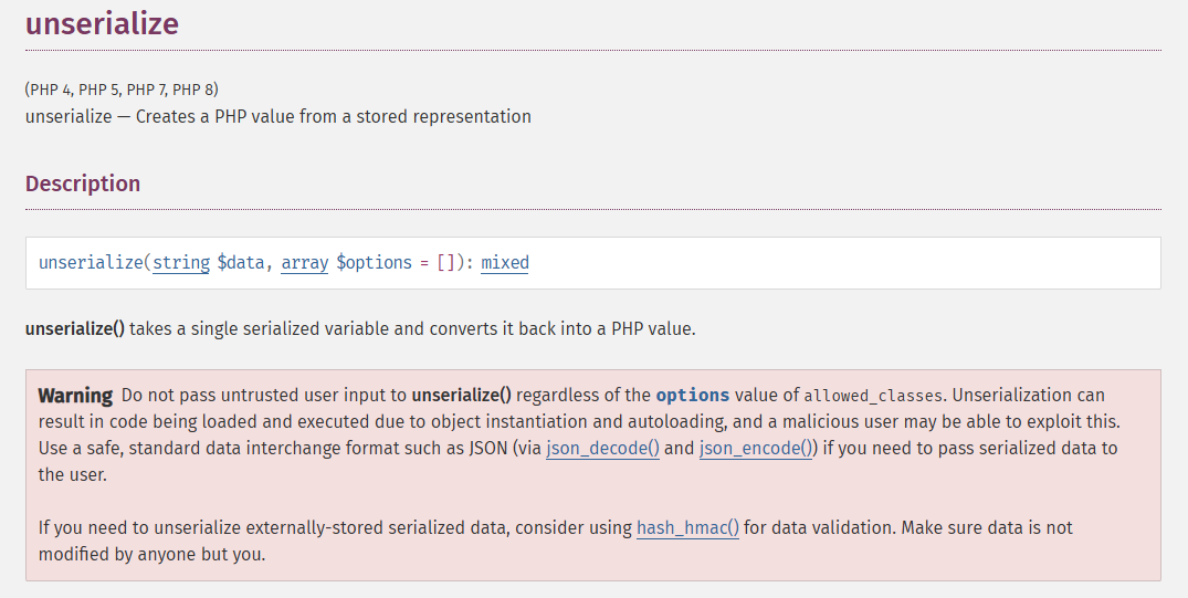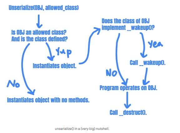 Giờ chúng ta sẽ tìm hiểu nguyên nhân chính dẫn tới lỗ hổng Insecure Deserialization trong PHP, hàm unserialize(). Cụ thể là hàm này hoạt động như này, và vì sao dẫn tới lỗ hổng