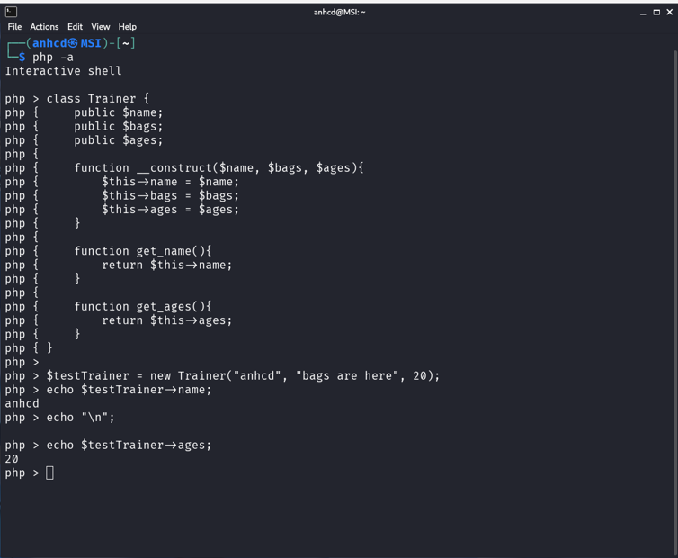 $testTrainer = new Trainer("anhcd", "bags are here", 20);
