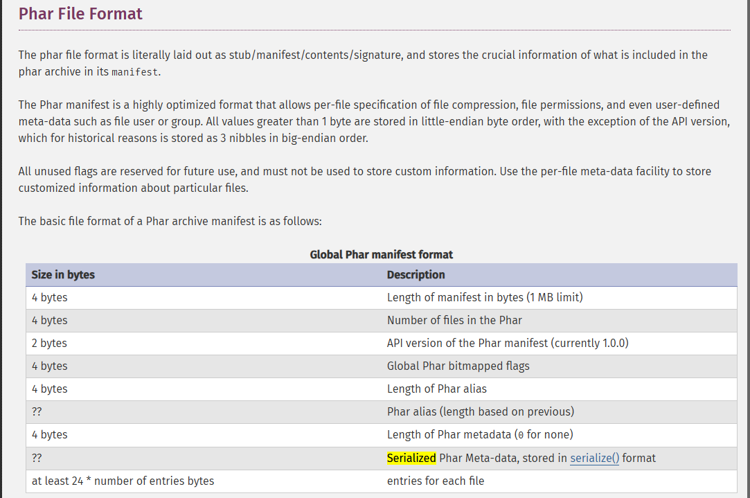 Như mình đã đè cập, điểm đáng chú ý trong cấu trúc của file PHAR nằm ở mục manifest. Theo php.net thì phần manifest có thể chứa các thông tin sau: